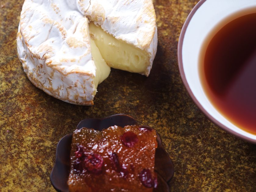 La texture très crémeuse et fondante contrastant avec la croûte aux arômes puissants aux notes animales se marie avec la fraîcheur et l’acidulé de la pâte de fruits et le velouté aux notes sous-bois et animales du thé.