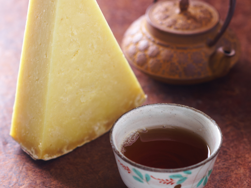 La texture légèrement granuleuse aux notes beurrées et fruits secs du fromage se délite délicatement en bouche au contact du thé chaud charpenté aux arômes de tabac et de fruits surs mûris. La gelée sucrée et mentholée apporte une touche de fraîcheur.