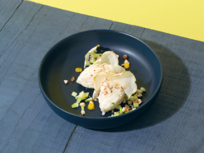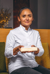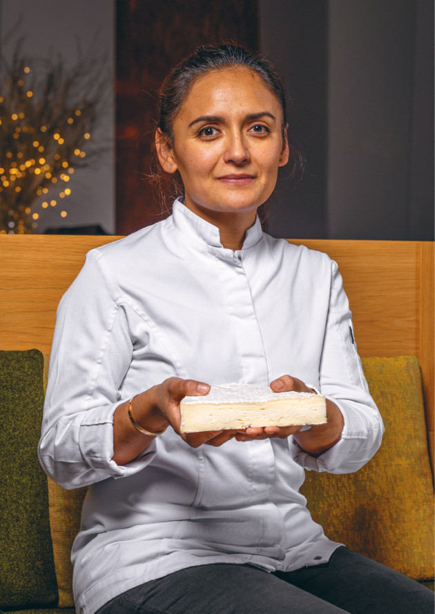 Quand on m’a appelée pour Sweet Cheese, j’étais heureuse parce que j’adore les défis, mais aussi parce que c’était l’occasion de travailler en équipe. Sans une brigade merveilleuse, une cheffe n’est rien. Tout le monde a participé, c’est mon mari qui a eu l’idée du jeu de mots. Dans mon enfance, mes deux desserts préférés, c’était la crème caramel et le riz au lait. Au Mexique, on n’y met pas de cannelle mais des fruits confits, des agrumes. Grâce au jeu de mots de Mathieu, on est parti sur l’idée de remplacer le lait et le sucre par du Brie. J’aime tous les fromages français mais j’aime bien le côté moelleux du Brie. Il vient enrober le riz à la cuisson. Ça donne un côté nacré incroyable, j’aurais pu le servir juste dans un bol pour admirer la brillance du résultat. Pour rafraîchir le tout, j’ai pensé à la pomme, en trois textures, crue, déshydratée et en gelée. C’est un vrai dessert qu’un Mexicain pourrait manger les yeux fermés !