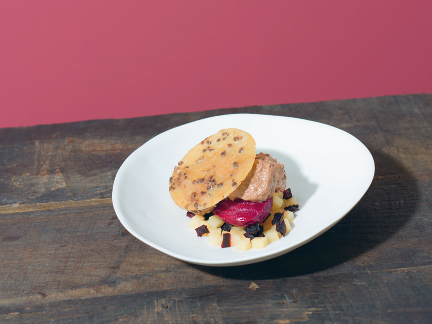 Le fromage anglais connaît un renouveau, notamment grâce au travail de Neal’s Yard Dairy. Mais c’est en France que j’ai découvert les incroyables vitrines des fromageries ! Au restaurant, j’en mange tous les jours, il y en a près du passe, à côté du pain. J’adore le Comté, d’hiver ou d’été, plus ou moins affiné, mais aussi les fromages bleus. Pour Sweet Cheese, j’ai choisi un accord Roquefort et chocolat, deux produits fermentés avec une bonne acidité, des notes de café, de cerise noire. Je voulais faire un dessert en plusieurs textures où le Roquefort donne du peps, un côté salin, tannique. Incorporé dans une mousse au chocolat, il apporte du crémeux mais aussi de la légèreté. Le sorbet betterave est là pour la fraîcheur, le coing marche très bien avec les fromages bleus, et la tuile, c’est pour le croquant.