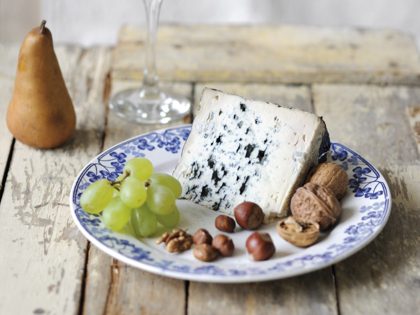 Fine croûte humide jaune orangée tachetée de duvet blanc, pâte humide brillante persillée de moisissures grises à vertes qui se développent dans les cavités.