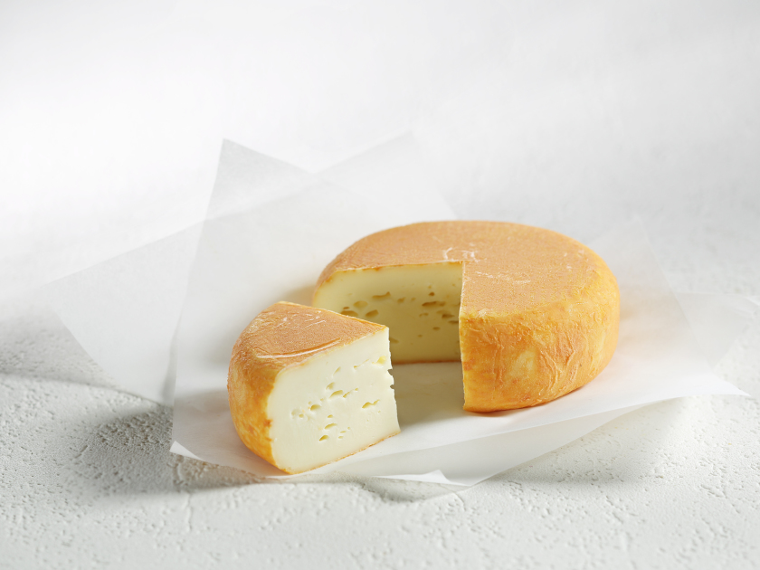 Croûte fine et lisse jaune orangée avec une pâte très moelleuse parsemée de nombreux petits trous