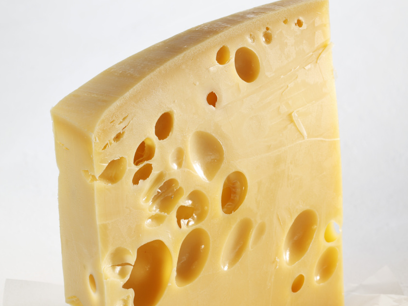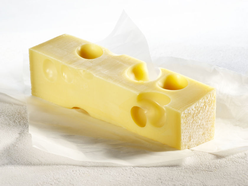 Sa croûte est sèche et très lisse et fine. Sa pâte homogène comporte de très nombreux gros trous appelés les « yeux » répartis de façon homogène dans la pâte lisse, jaune et brillante.