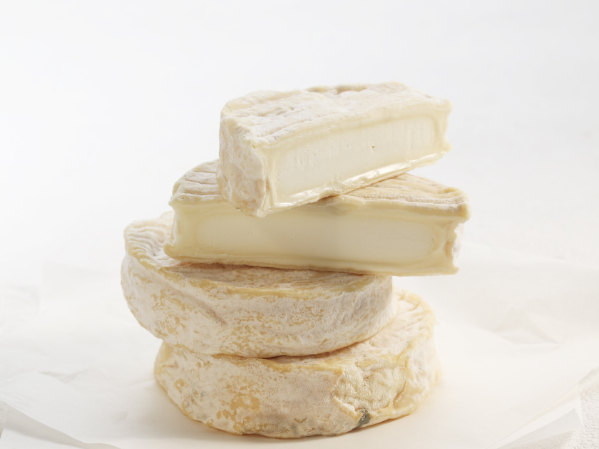Fromages à pâte molle et à fine croûte fleurie de couleur jaune crème à blanc-cassé, assez régulière.
