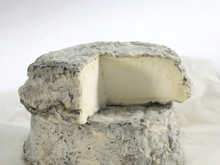 Croûte fine cendrée de couleur grise et poudreuse, pâte bien blanche, dense et un peu humide lorsque le fromage est jeune.